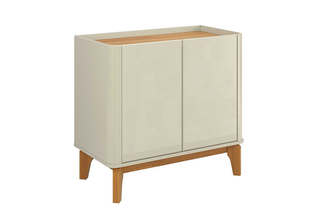 Este buffet combina design e funcionalidade com seus cantos arredondados e pés em madeira maciça. As portas com puxador clean e fechamento suave (slow motion) revelam prateleiras internas que oferecem uma organização impecável para seu ambiente. É a peça perfeita para adicionar elegância e praticidade.