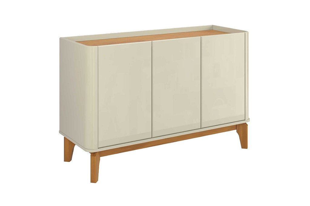 Este buffet combina design e funcionalidade com seus cantos arredondados e pés em madeira maciça. As portas com puxador clean e fechamento suave (slow motion) revelam prateleiras internas que oferecem uma organização impecável para seu ambiente. É a peça perfeita para adicionar elegância e praticidade.