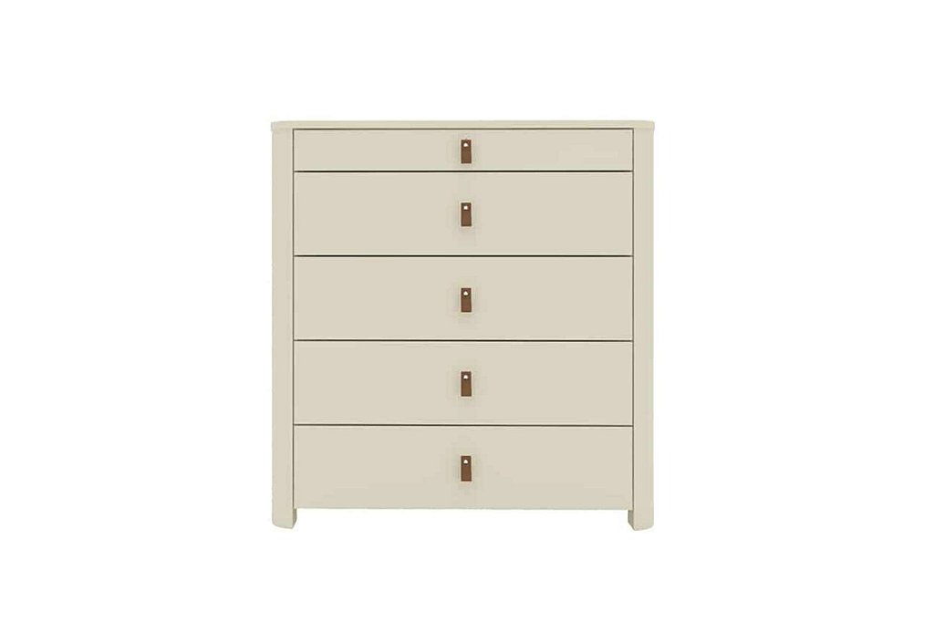 Cômoda com tampa de vidro, gaveta para joias, cantos curvos e gavetas com corrediças telescópicas para elegância e praticidade.