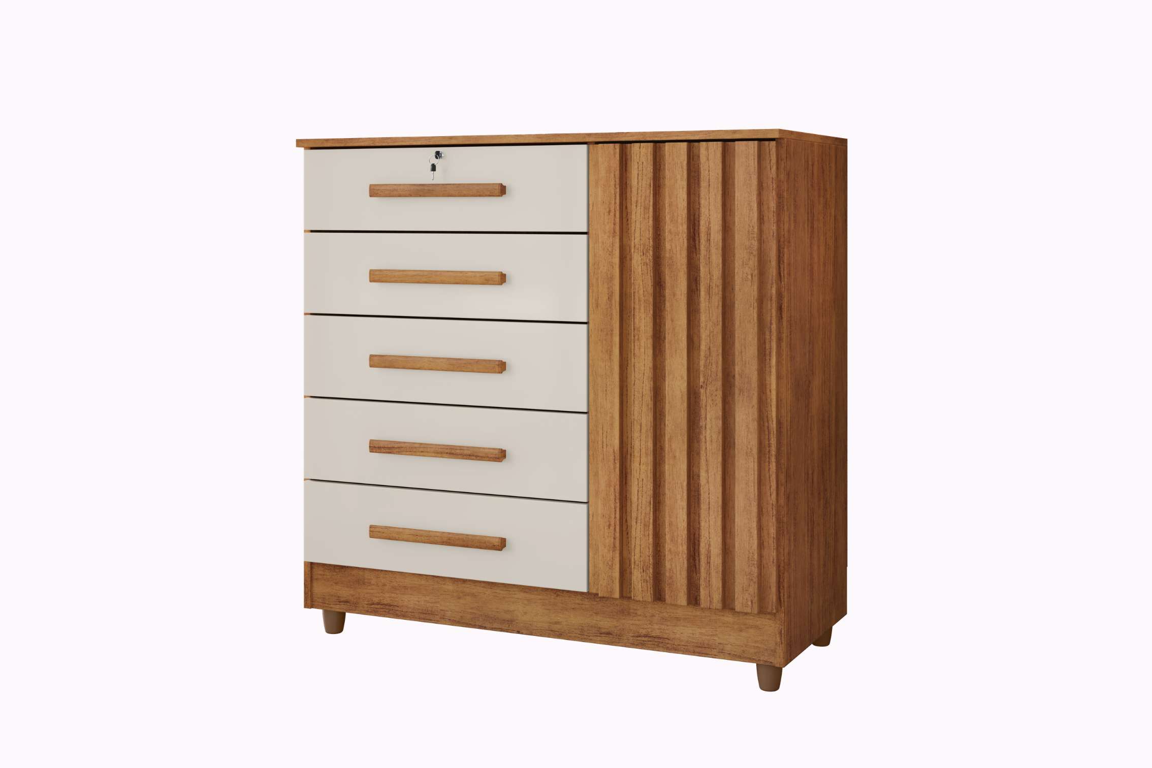Cômoda com design moderno e porta com detalhe ripado que traz elegância e personalidade para o seu quarto, com gavetas equipadas com corrediças telescópicas para abertura suave e prática, enquanto a porta conta com dobradiças metálicas resistentes, além de 1 gaveta com fechadura e chave que oferece mais segurança e organização no dia a dia.
