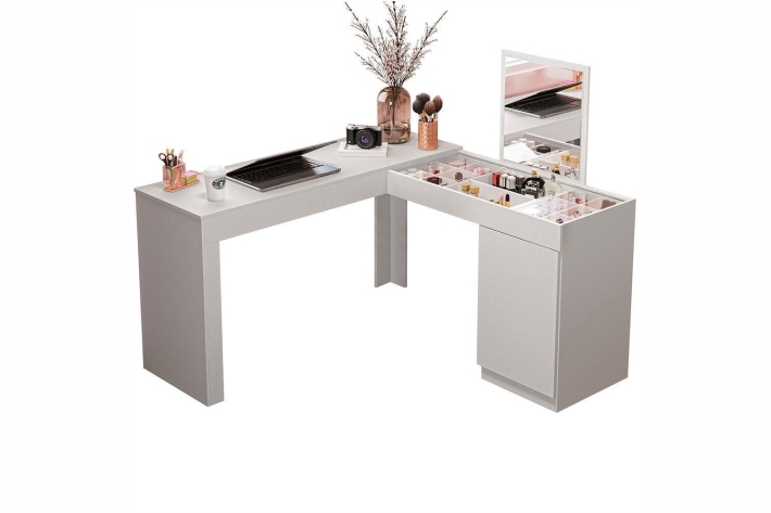 Descubra a versatilidade da nossa escrivaninha penteadeira em MDP, com espelho fixo e prático armazenamento através de uma porta com prateleira interna, tudo em elegante acabamento fosco em pintura UV.