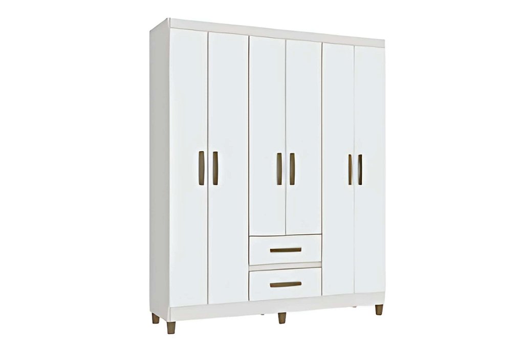 Guarda-roupa com estrutura em MDP de 12mm na caixa e frentes, unindo resistência e durabilidade.Conta com 6 portas e 2 gavetas com corrediças telescópicas, que proporcionam abertura suave e eficiente.