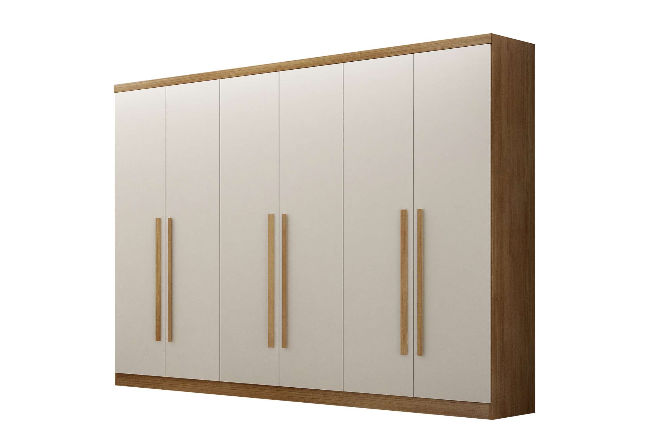 Guarda-roupa com excelente divisão interna, incluindo espaço “ele e ela” para mais organização no dia a dia, conta com puxadores com acabamento amadeirado e dobradiças de pressão 35mm que garantem praticidade e durabilidade, além de gavetas internas com corrediças telescópicas que proporcionam abertura suave e melhor aproveitamento do espaço.