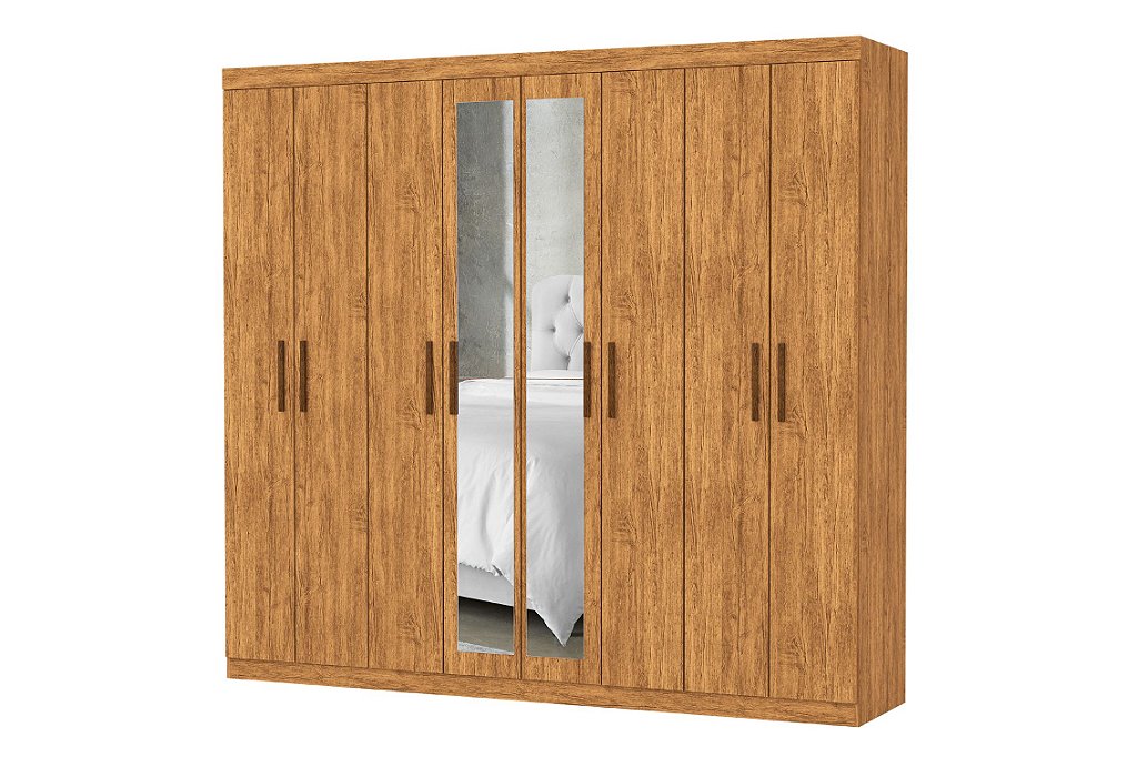 Guarda-roupa sofisticado em MDP, com 8 portas (sendo 2 com espelhos) e 2 gavetas, oferecendo organização prática e um toque de elegância. Perfeito para compor ambientes modernos com funcionalidade e estilo impecáveis!