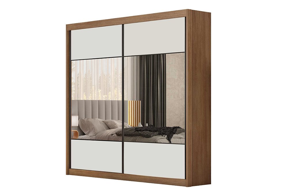 Elegante e funcional, este guarda-roupa 100% MDF com colunado de 25mm oferece amplo espaço interno no modelo Ele e Ela. Uma das duas portas conta com espelho, unindo praticidade e sofisticação ao ambiente. Trilhos de alumínio, roldanas com amortecedores e corrediças telescópicas garantem abertura suave e durabilidade.