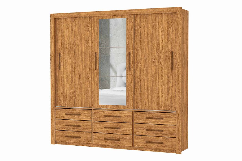 Guarda-roupas moderno e versátil, com 3 portas (sendo 1 com espelho) e 9 gavetas amplas, tudo em MDP. Ideal para quem busca organização impecável e um design que eleva qualquer ambiente!