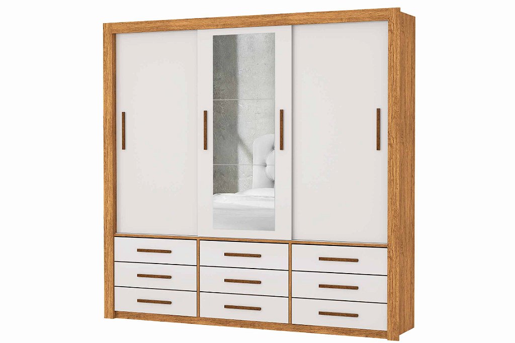 Guarda-roupas moderno e versátil, com 3 portas (sendo 1 com espelho) e 9 gavetas amplas, tudo em MDP. Ideal para quem busca organização impecável e um design que eleva qualquer ambiente!