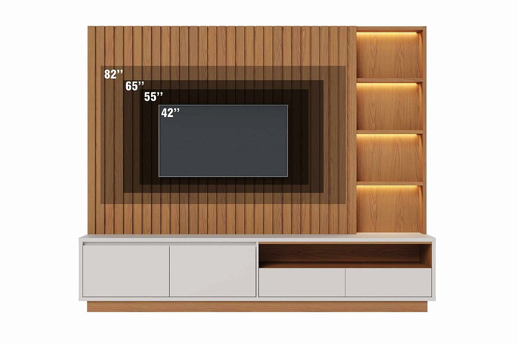 O home perfeito para transformar sua sala em um verdadeiro cinema! Com capacidade para TVs de até 82 polegadas, ele combina beleza e funcionalidade. Seu painel ripado traz um toque moderno e elegante, enquanto as quatro prateleiras com iluminação LED destacam objetos decorativos de forma sofisticada. Além disso, conta com quatro gavetas espaçosas equipadas com corrediças telescópicas, que garantem abertura suave e muito mais praticidade no dia a dia.