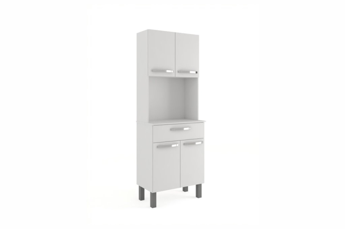 Possui estrutura produzida em MDP de 12 e 15 mm, com portas em MDP de 15 mm. Acabamento interno e externo com pintura UV na cor branco brilho. As dobradiças utilizadas na porta são metálicas de pressão 26mm. O sistema de montagem é feito com parafusos e cavilhas. Os puxadores são em ABS modelo perfil. O sistema de embalagem é feito com tampo e fundo, o qual aumenta a proteção dos volumes no transporte e manuseio.