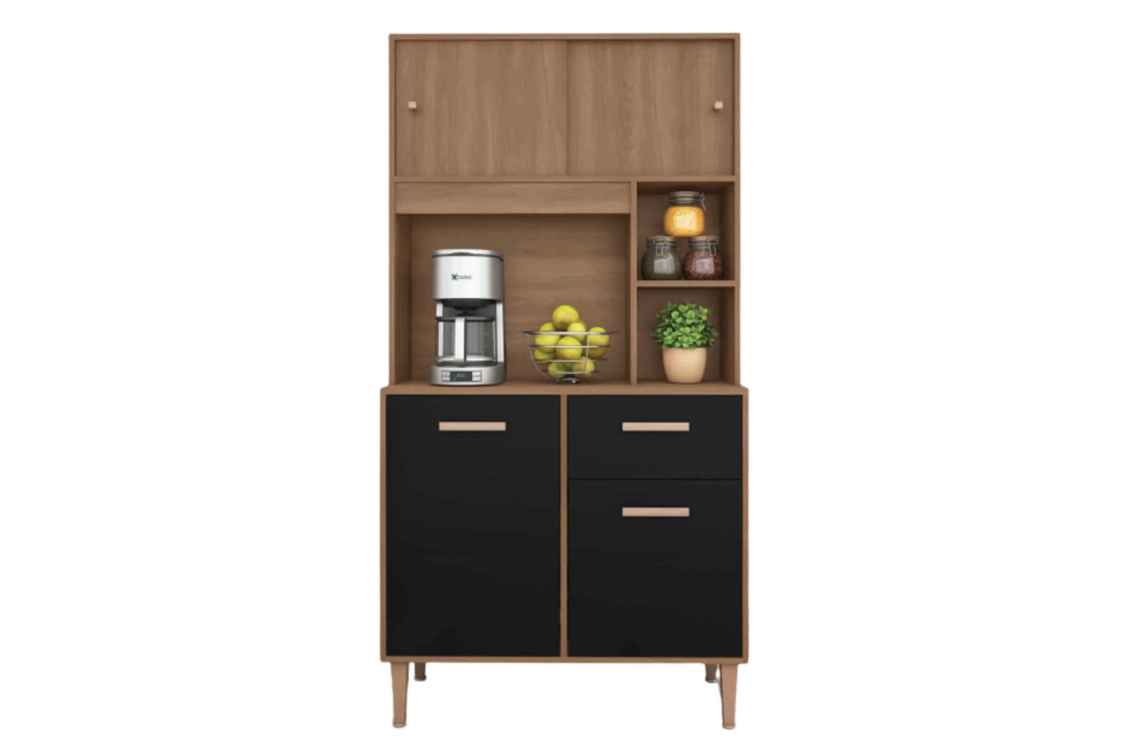 Possui dobradiças e corrediças metálicas, que garantem maior durabilidade.