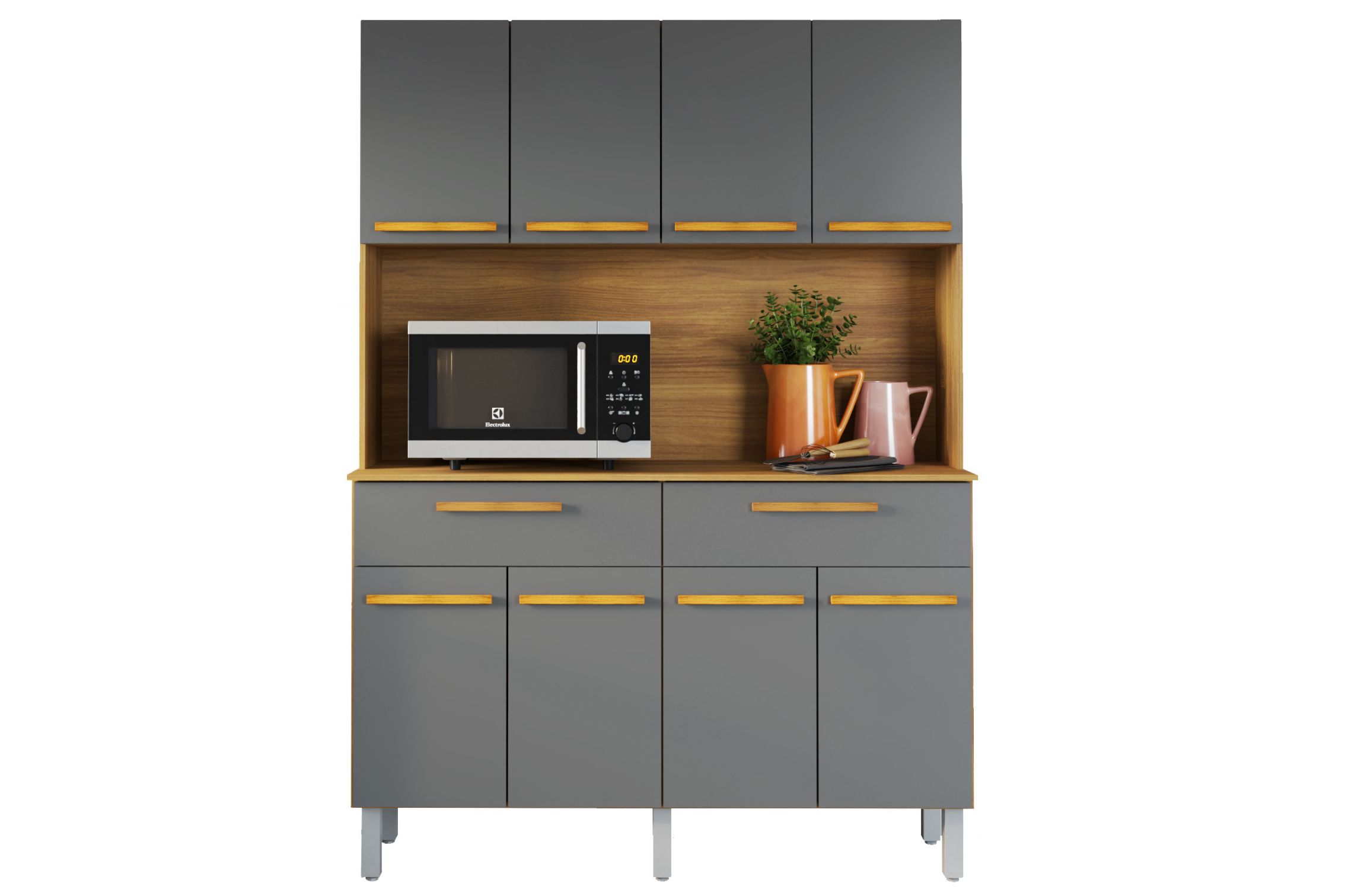Kit cozinha com acabamento interno e externo em pintura UV, que garante um visual moderno e fácil manutenção. Conta com dobradiças metálicas de pressão, duas gavetas com corrediças metálicas para mais praticidade no dia a dia e puxadores em MDF revestido, trazendo um acabamento elegante para o ambiente.