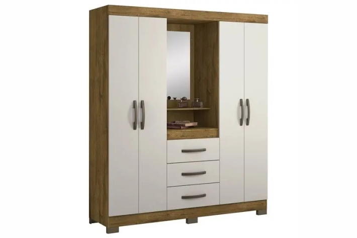 Medidas (cm): (A x L x P) 188 x 161 x 45 cm Descrição Técnica: - Produzido em MDP - 4 portas e Prateleiras internas - 3 gavetas com corrediças metálicas; - Espelho central / Cabideiro e calceiro internos - Pintura Ultravioleta. Mais Informações: Um clássico que é sucesso a muito tempo, o Guarda-Roupa NT 5015, possui o famoso modelo Capelinha com espelho centralizado. Ele possui um amplo espaço, e sua estrutura é formada por 3 gavetas externas, um calceiro e um cabideiro em madeira e 3 prateleiras para uma melhor organização. Informações importantes: As cores do produto podem variar de acordo com o seu monitor, a iluminação do ambiente em que você está e até mesmo a sua percepção visual. Além da cor pequenos detalhes e acabamentos podem não ficar evidentes na foto, por isso as imagens são meramente ilustrativas. Os objetos decorativos que aparecem na foto não acompanham o produto.