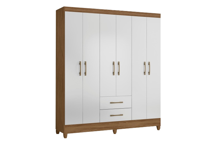 Transforme seu quarto com elegância e praticidade com o Guarda-Roupa de 06 portas de giro! Com 02 gavetas espaçosas e corrediças metálicas, este móvel é perfeito para manter suas roupas organizadas e sempre à mão. Os puxadores cor bronze e os pés em PVC garantem um toque sofisticado ao ambiente.