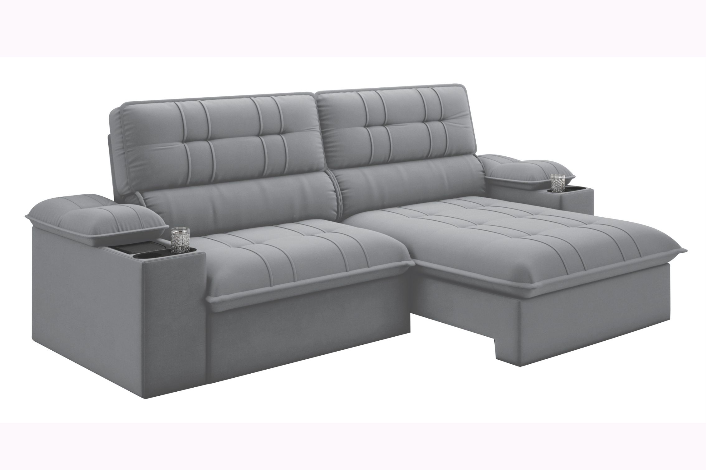 Este sofá combina conforto e funcionalidade, apresentando porta-copos e cooler embutido para seu lazer e praticidade. Seu assento durável com molas espirais, percinta elástica e espuma D28 garante suporte ideal, e o prático sistema bipartido simplifica a entrega e montagem.